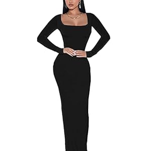 Doweha Women’s Square Neck Long Sleeve Black Maxi Dress Sexy Knit Bodycon Long Dress for Women