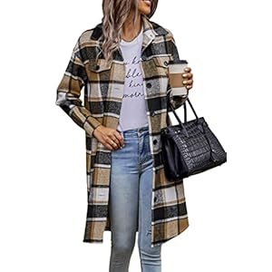 PRETTYGARDEN Women’s Plaid Shacket 2023 Long Sleeve Button Up Flannel Shirt Winter Tartan Jacket Woolen Coats (Khaki,Medium)