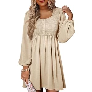 Dokotoo Womens 2025 Casual Dresses Smocked Crewneck Button Up Long Sleeve Empire Waist A-Line Mini Dress