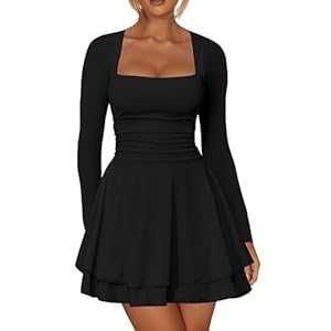 Kaximil Women’s Square Neck Ruffle Hem Mini Dress Ruched Waist Long Sleeve Corset Short Party Dresses