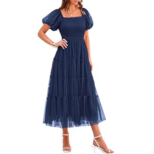PRETTYGARDEN Women’s Smocked Midi Tulle Dress 2025 Summer Puffy Short Sleeve Square Neck Ruffle Wedding Guest Party Dresses